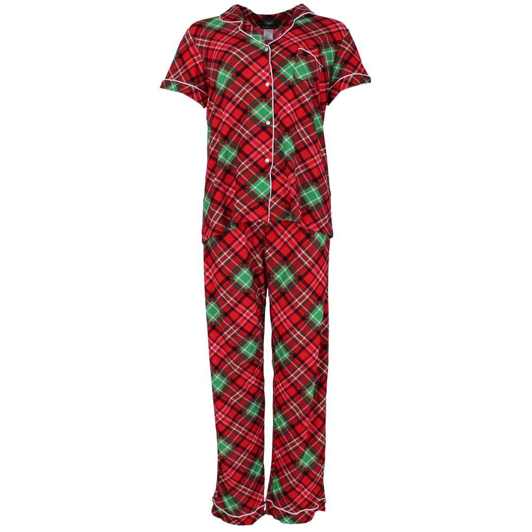 Celebrate the season in cozy style with this women's plaid pajama set. Designed with a classic notch-collar short-sleeve top and matching pants, this set features a cheerful plaid pattern in traditional Christmas colors for a timeless holiday look. The button-front top adds a touch of charm, while the soft, breathable fabric and relaxed fit keeps you comfortable all night long. Perfect for sipping cocoa, trimming the tree,or lounging by the fire in festive spirit.