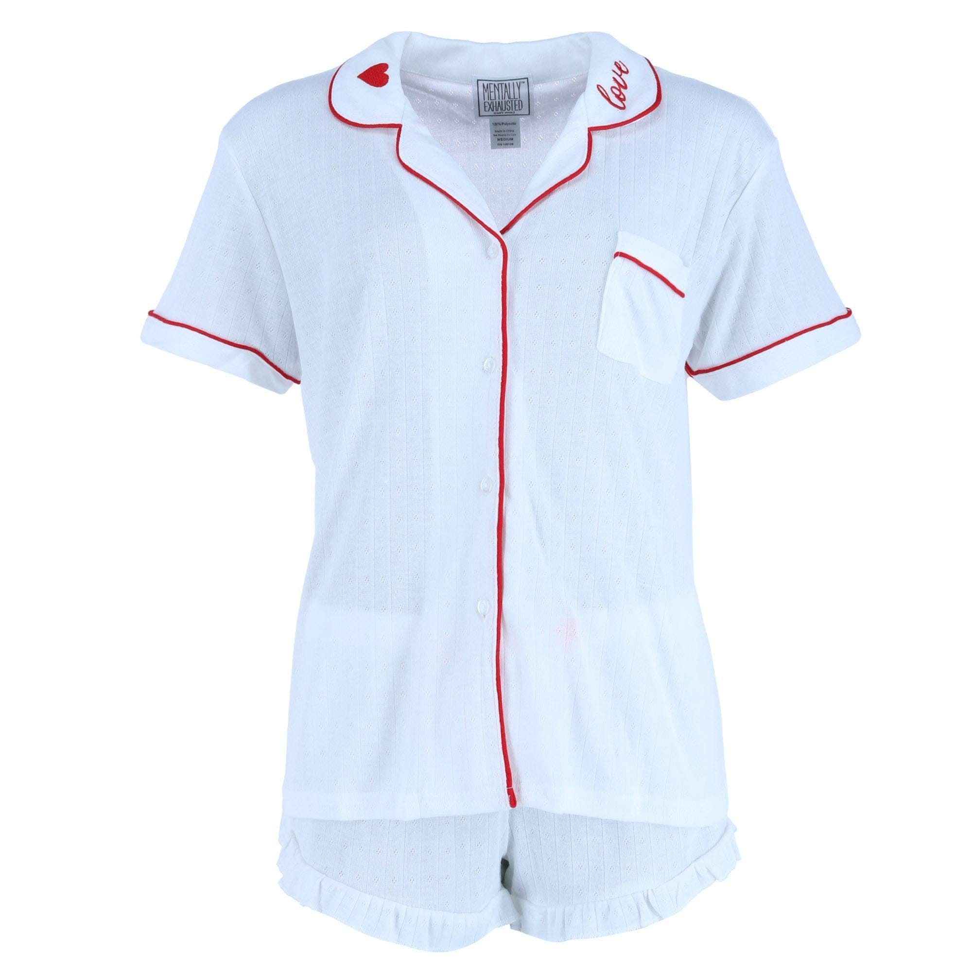 This adorable pointelle two-piece short-sleeve and shorts set will be your new go-to pajama set. This set features a short-sleeved shirt with red trim and shorts, which is excellent for all-year wear. The top features a collar with buttons down the front and love verbiage and a heart on the collar. The shorts feature an elastic waistband and an eye-catching bow with a relaxed fit