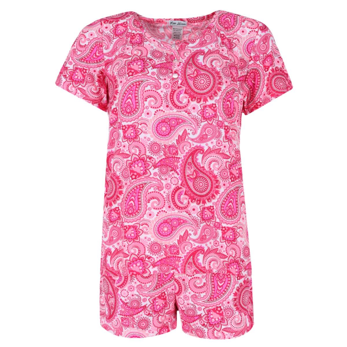 This pajama set is super soft and comfortable with its lightweight and stretchy fabric. The bright pink color and fun, glittery paisley pattern is perfect for Spring and Summer. The short sleeve top has a faux three button-down henley neckline. The shorts have an elastic waistband with a decorative bow. This would make a great gift or a nice refresh to your sleepwear or loungewear wardrobe.
