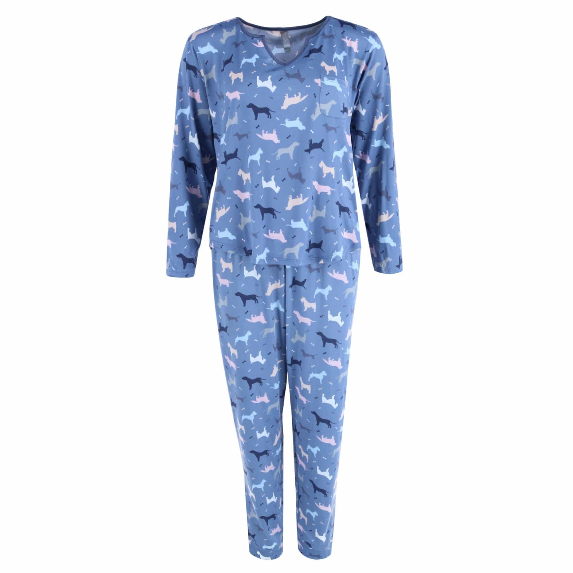 This adorable and cozy pajama set showcases a charming dog print pattern, offering various pups. The ensemble includes a long-sleeve top and jogger-style bottoms. The joggers have an elastic waistband, while the shirt boasts a convenient front pocket that adds to its style. This two-piece pajama set is perfect for relaxed lounging at home and a good night's sleep.