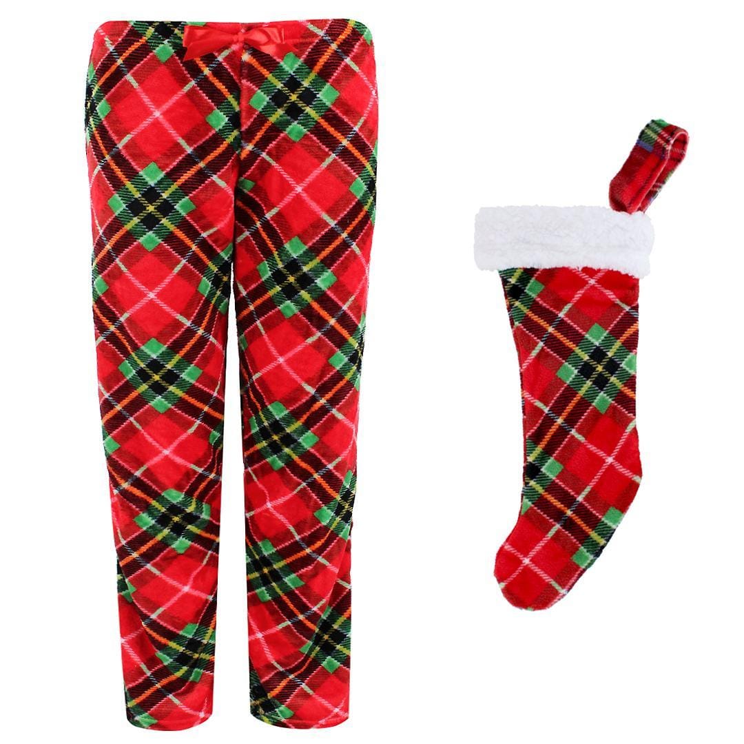 Celebrate the season in cozy style with these plaid pajama pants, complete with a matching plush stocking for an extra dose of holiday charm. The pants feature a lightweight fabric that is perfect for unwinding, relaxing, and enjoying all the merry moments of the season. Whether you are giving as a gift or keeping for yourself, celebrate the magic of the Holidays with this adorable set.
